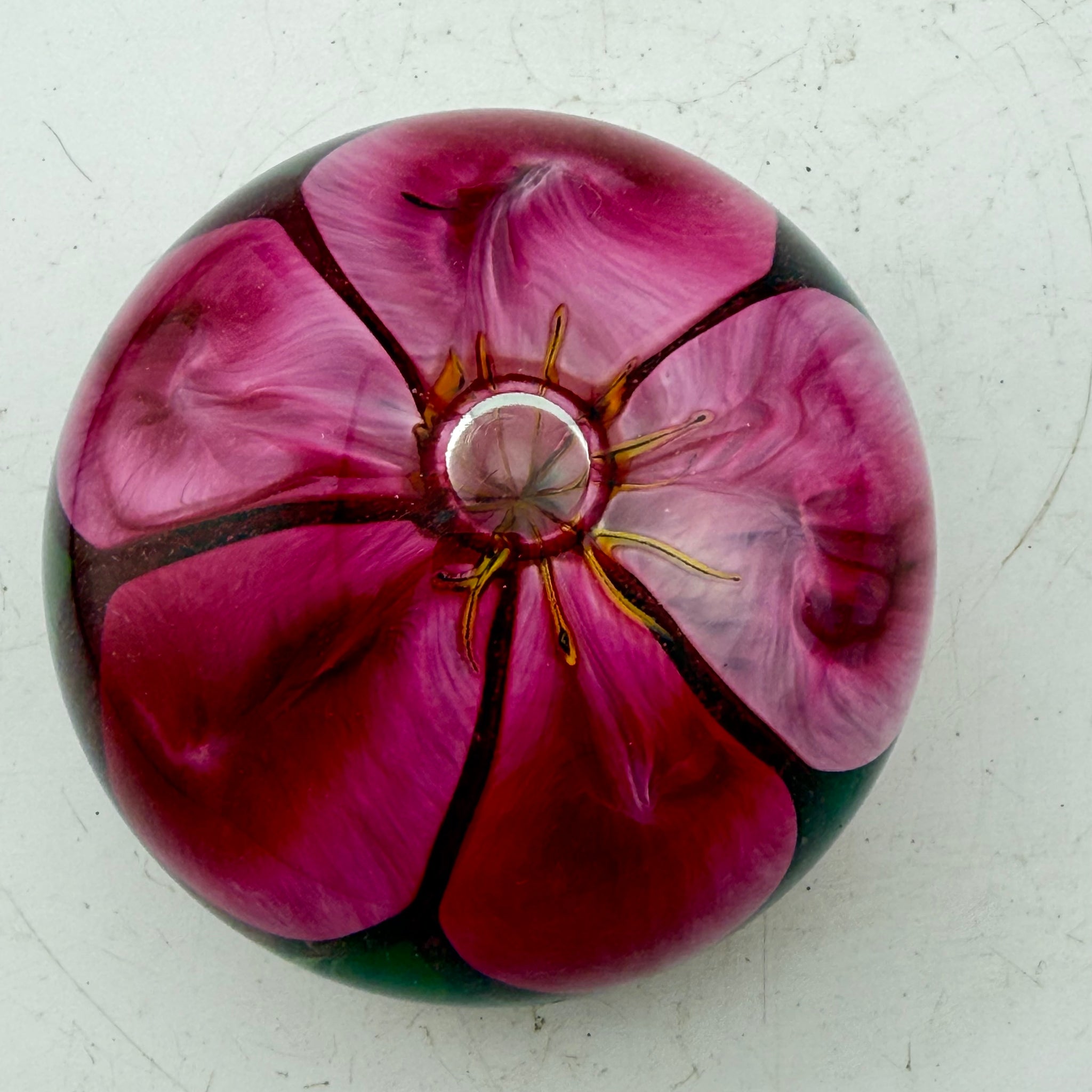 Signed and dated pink flower paperweight