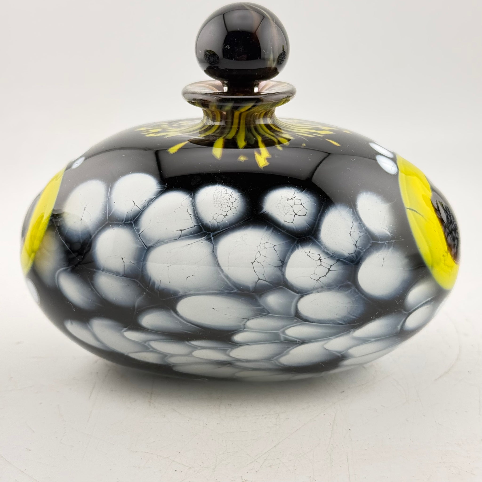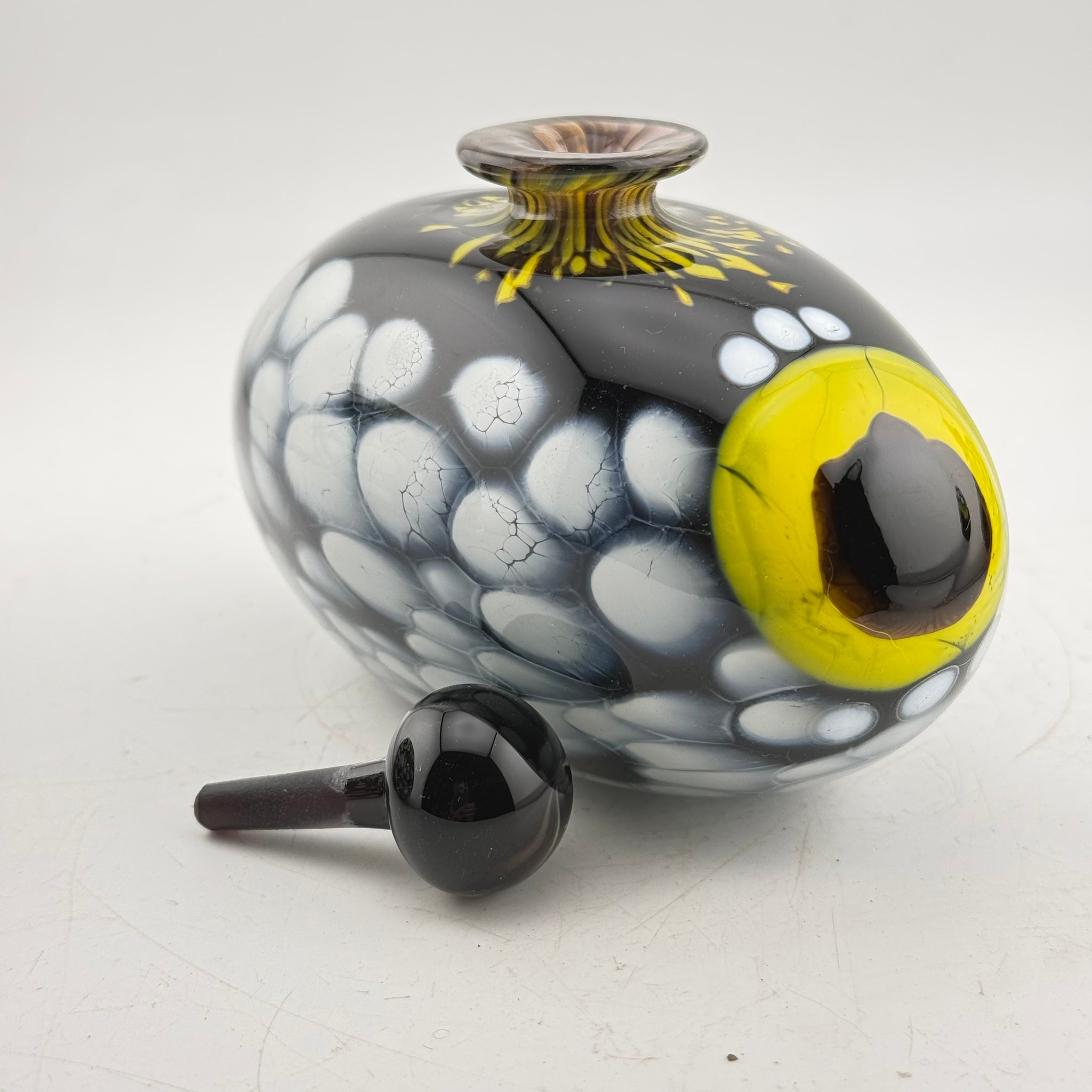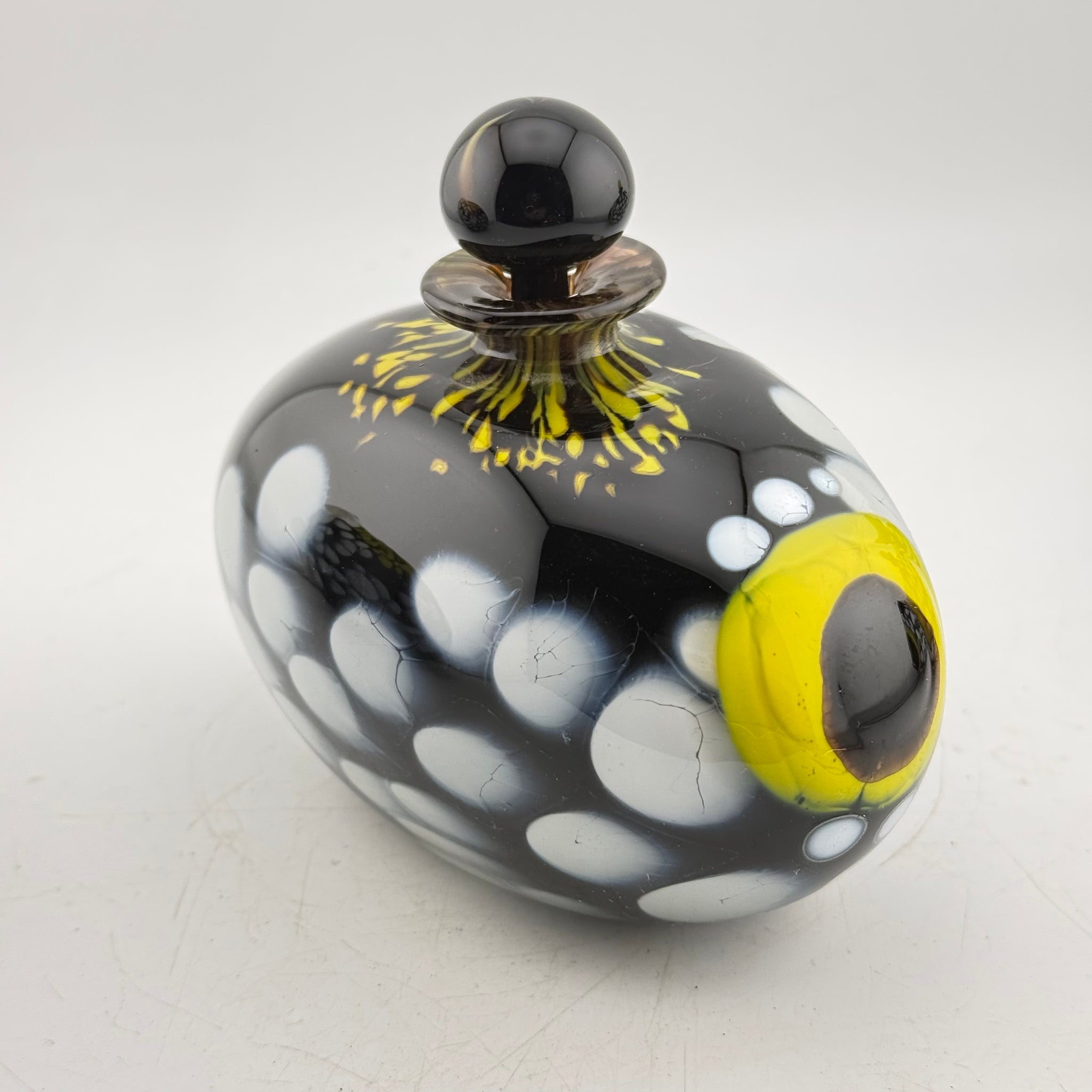 This is a signed and dated black and yellow “Clown Trigger Fish” scent bottle