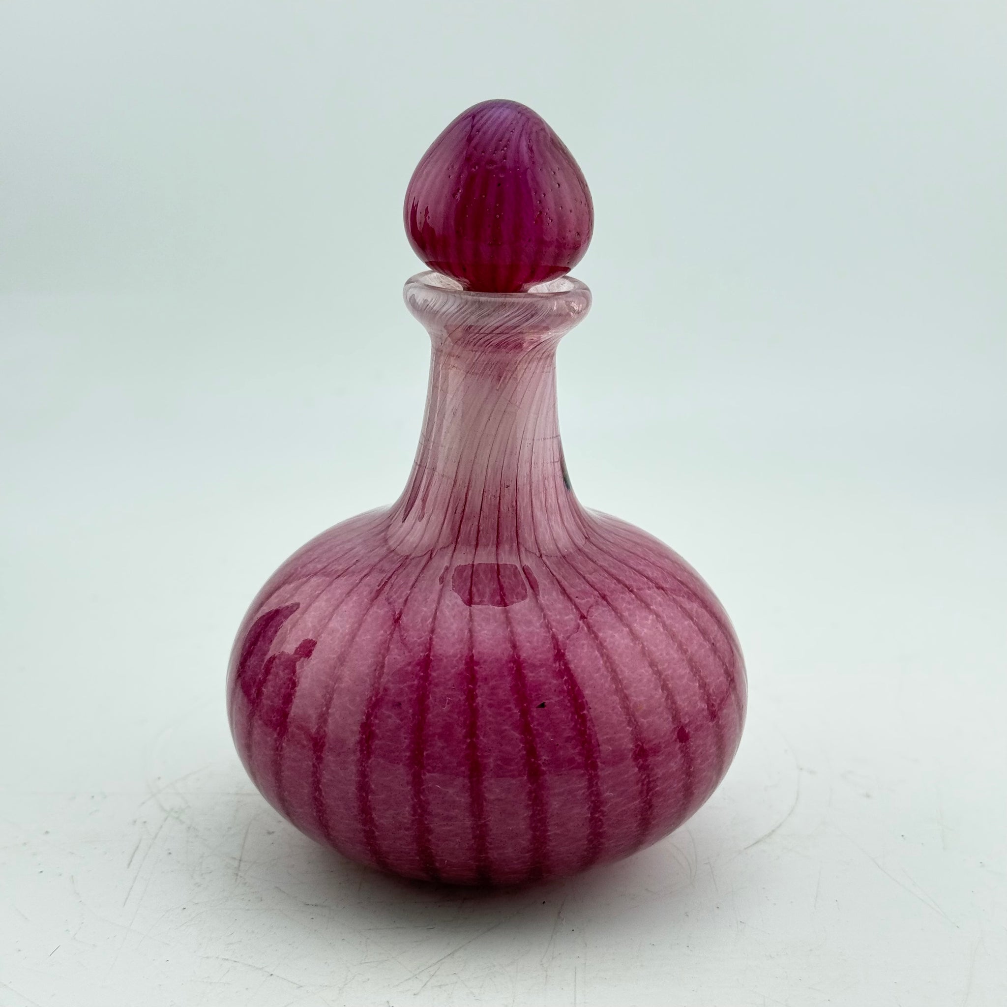 This is a pink striped scent bottle with a round stopper