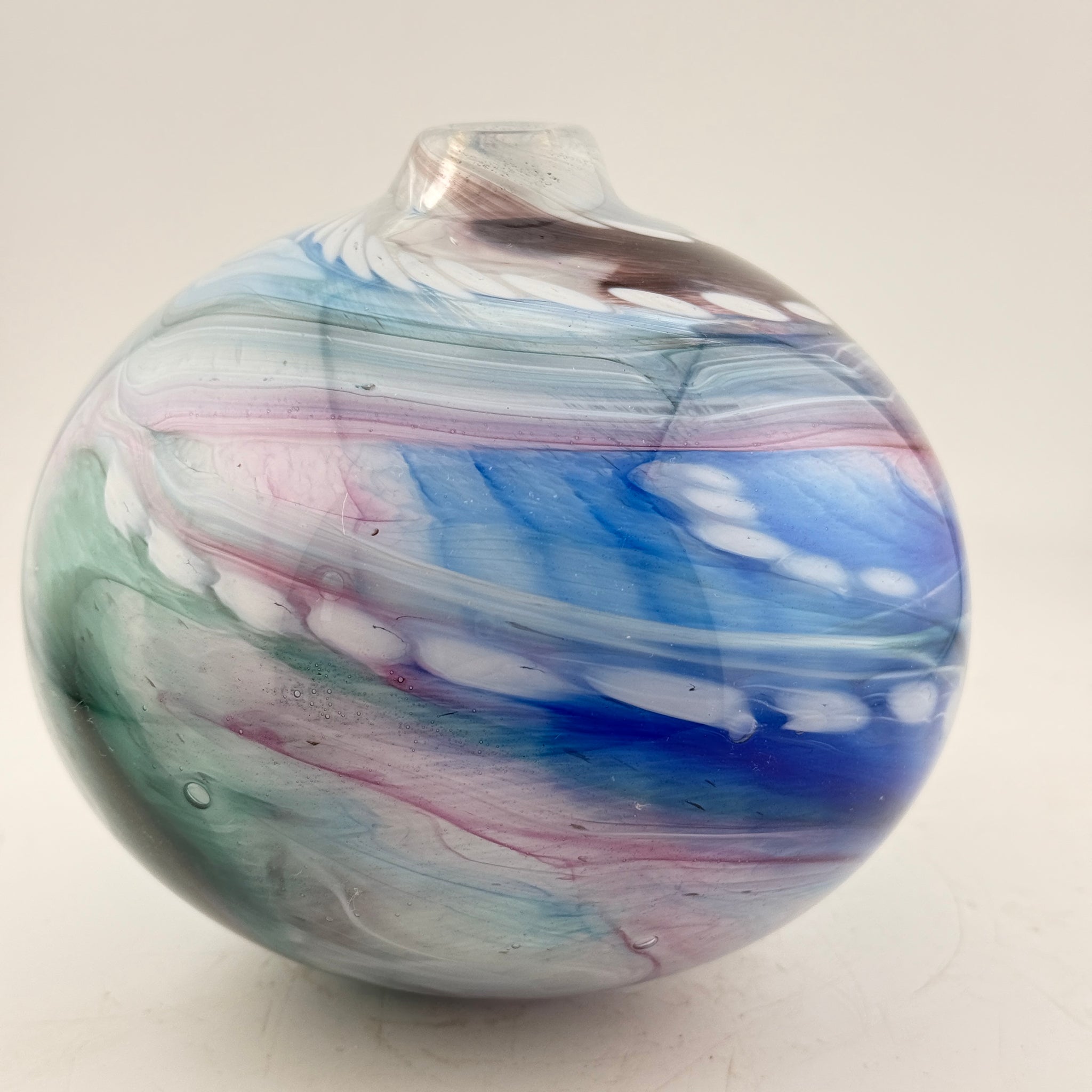 This is a teal, pink, black, blue and white round vase